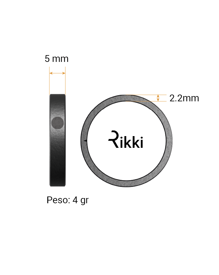 Anillo de cerámica de grado médico. Muy resistente a arañazos y a pequeños golpes de uso diario. Sin móvil. Sin batería. Sumergible hasta 50m de profundidad. Grosor: 2.2mm. Peso: 4 gr.